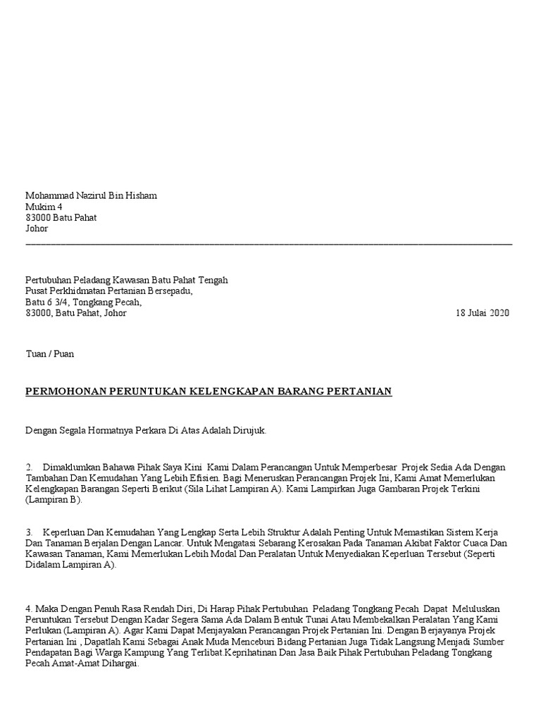 Surat Permohonan Bantuan Pertanian Pertubuhan Peladang Pdf